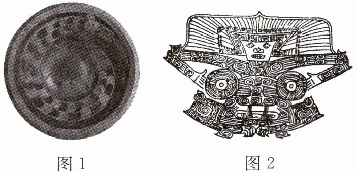 材料一 读下图(图1为陶寺古城遗址出土的彩绘龙纹陶盘;图2为良渚古城遗址出土的神人兽面纹线描图)