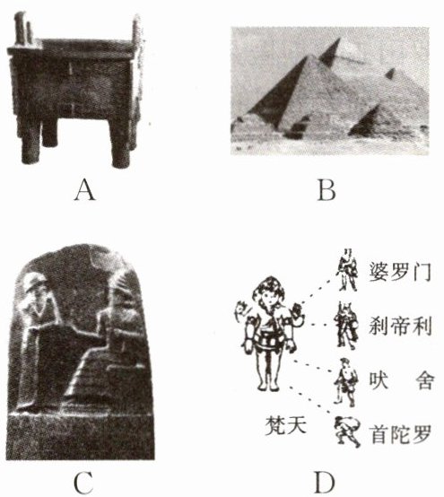 【思路导析】 A 选项图片是中国商代的青铜器司母戊鼎;B 选项图片是古埃及文明成果金字塔;C 选项图片中石柱上雕刻的是古巴比伦的《汉谟拉比法典》;D 选项图片反映了古印度的种姓制度。