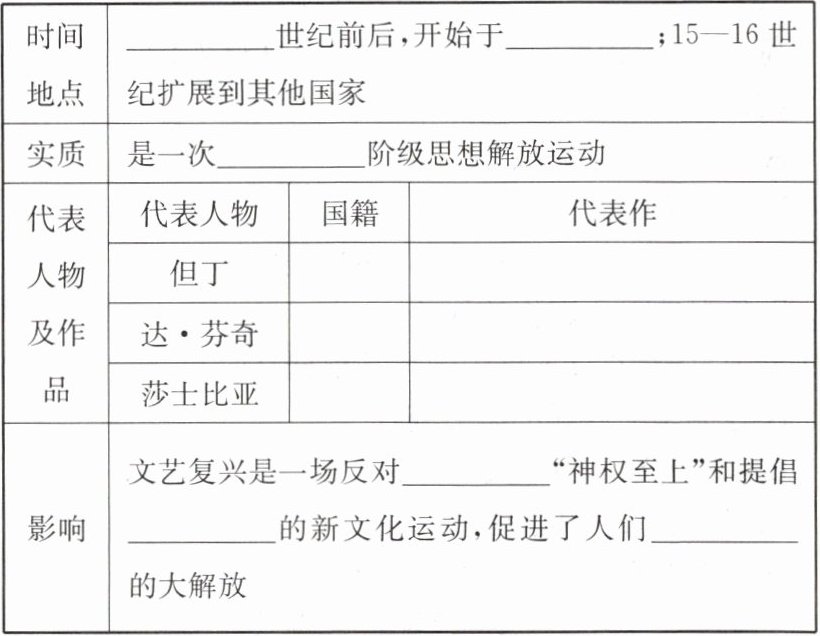 |代表人物及作品|代表人物:但丁,国籍:__,代表作:__代表人物:达·芬奇,国籍:__,代表作:__代表人物:莎士比亚,国籍:__,代表作:__|