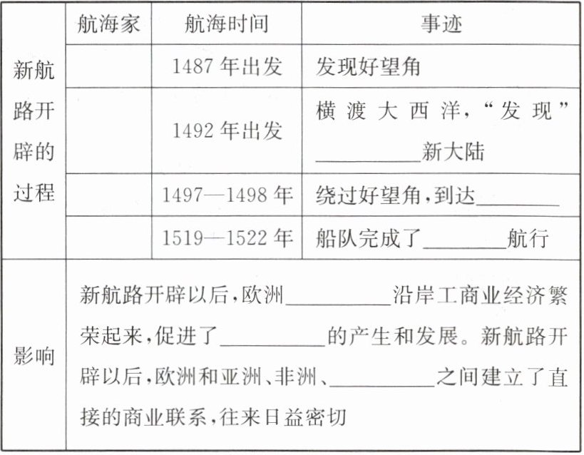 |新航路开辟的过程|航海家:__,航海时间:1487年出发,事迹:发现好望角航海家:__,航海时间:1492年出发,事迹:横渡大西洋,“发现”__新大陆航海家:__,航海时间:1497—1498年,事迹:绕过好望角,到达__航海家:__,航海时间:1519—1522年,事迹:船队完成了__航行|