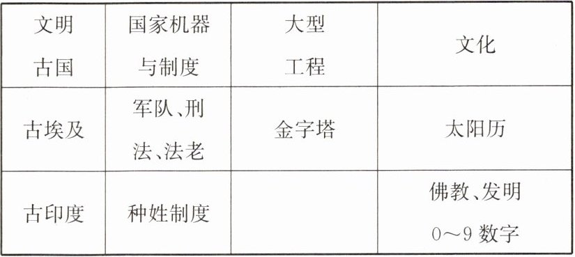 【思路导析】根据表中信息可知,古埃及和古印度在国家机器、国家制度、文化方面的发展各有特色,体现了古代文明的多样性。