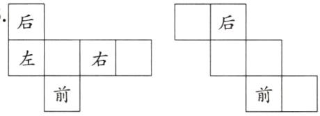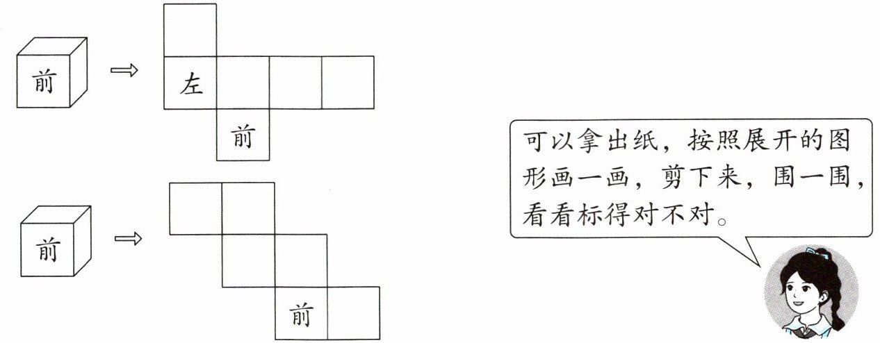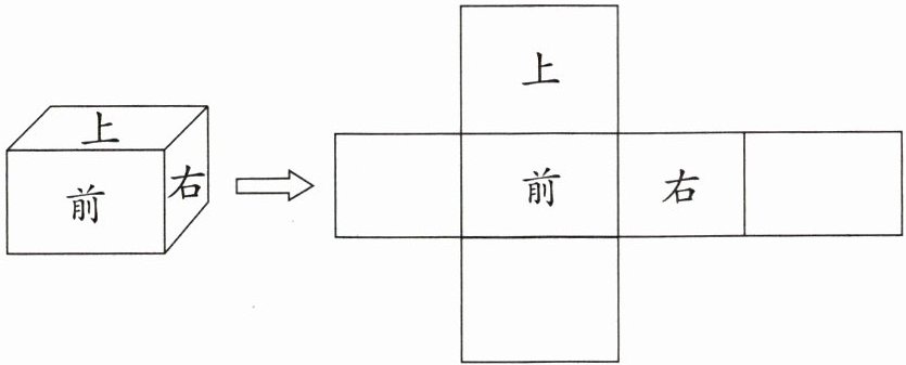 2. 把长方体纸盒沿着边剪开,得到它展开的图形,请根据图中确定的面,标出相对的面。