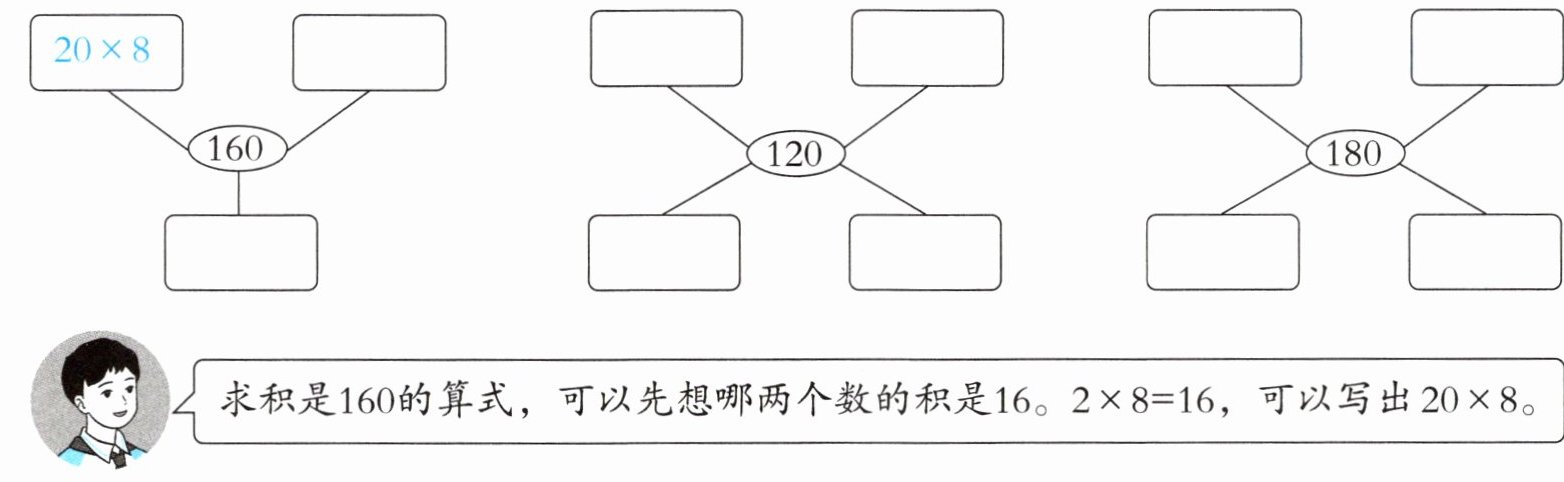求积是160的算式,可以先想哪两个数的积是16。$2 × 8 = 16$,可以写出$20 × 8$。