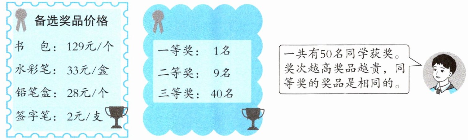 6. 学校组织知识问答活动,设计了三种奖次,需要给获奖的同学颁发奖品。请你从备选奖品中选择三种商品作为此次活动的奖品,要求购买奖品的总价接近但不超过500元。