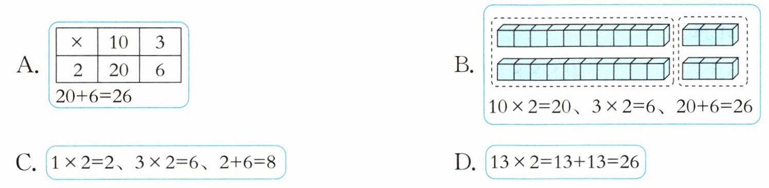 )。A.$\begin{array}{|c|c|c|} \hline × & 10 & 3 \\ \hline 2 & 20 & 6 \\ \hline \end{array}\\ \hline $ $20 + 6 = 26$