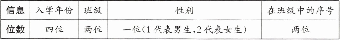 |位数|四位|两位|一位(1 代表男生,2 代表女生)|两位|