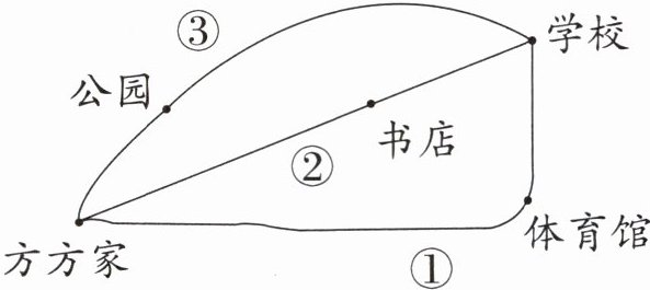 4. 方方从家出发去学校有三条路可以走(如图),哪条路最近?说说你的理由。