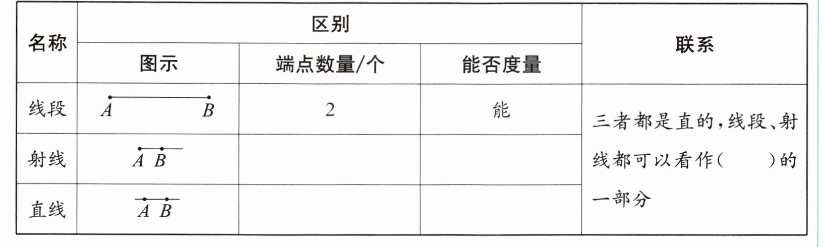 |线段||端点数量/个:2;能否度量:能|三者都是直的,线段、射线都可以看作(