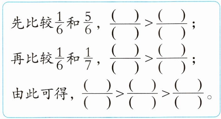 )} > \frac{( )}{( )}$;再比较$\frac{1}{6}和\frac{1}{7}$,$\frac{(