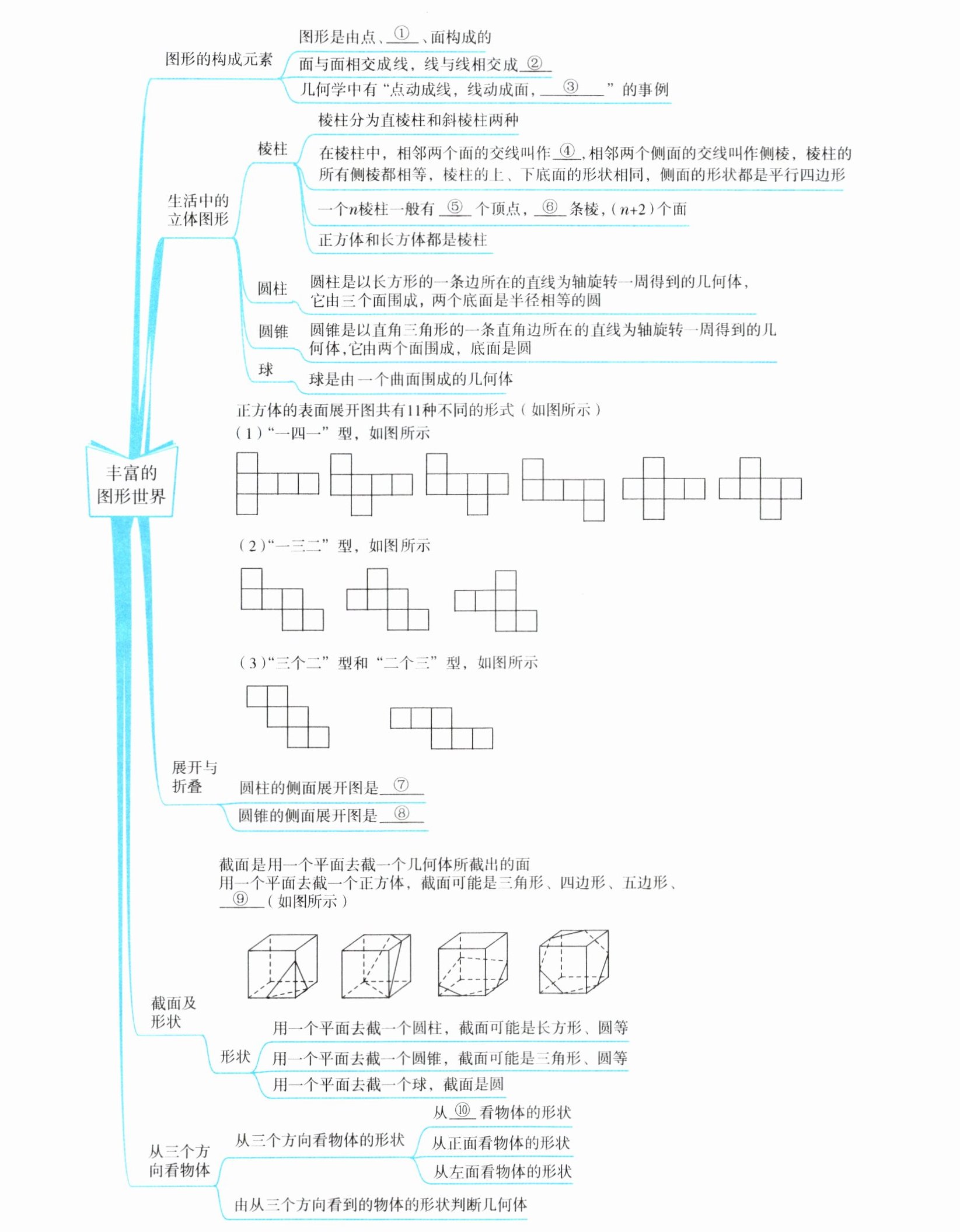 ⑦长方形 ⑧扇形 ⑨六边形 ⑩上面