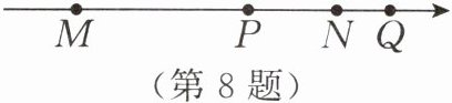 8. 如图,四个有理数在数轴上的对应点分别为$M$,$P$,$N$,$Q$。若点$M$,$N$表示的有理数互为相反数,则图中的点表示的数中,绝对值最小的是(