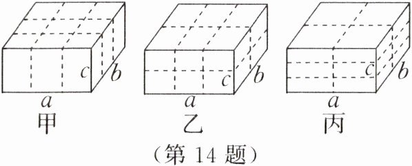 14. 【数学应用】有一个长方体形状的物体,它的长、宽、高分别为$a,b,c(a>b>c)$。现有三种不同的捆扎方式(如图所示的虚线),哪种方式用绳最少?哪种方式用绳最多?请说明理由。