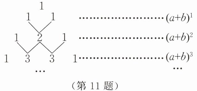 11.【数学文化】我国古代数学的许多发现都曾位居世界前列,其中“杨辉三角”就是一个。如图,这个三角形的构造法则是:两腰上的数都是 1,其余每个数均为其上方左右两数之和,它给出了$(a + b)^{n}(n$为正整数)的展开式(按$a$的次数由大到小的顺序排列)中各项的系数规律。例如,在三角形中第三行的三个数 1,2,1,恰好对应着$(a + b)^{2}$的展开式中各项的系数;第四行的四个数 1,3,3,1,恰好对应着$(a + b)^{3}$的展开式中各项的系数。