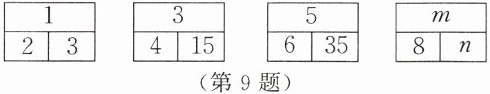 9. 如图,填在各方格中的三个数之间具有相同的规律,根据此规律,$n$的值是(