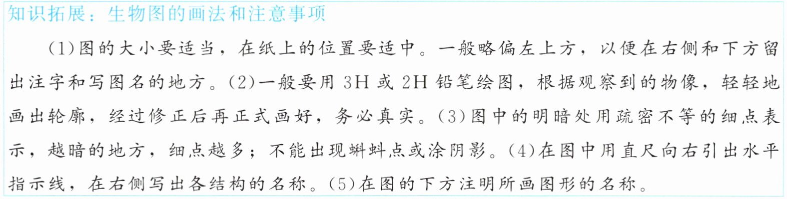 (1)图的大小要适当,在纸上的位置要适中。一般略偏左上方,以便在右侧和下方留出注字和写图名的地方。(2)一般要用 $3H$ 或 $2H$ 铅笔绘图,根据观察到的物像,轻轻地画出轮廓,经过修正后再正式画好,务必真实。(3)图中的明暗处用疏密不等的细点表示,越暗的地方,细点越多;不能出现蝌蚪点或涂阴影。(4)在图中用直尺向右引出水平指示线,在右侧写出各结构的名称。(5)在图的下方注明所画图形的名称。