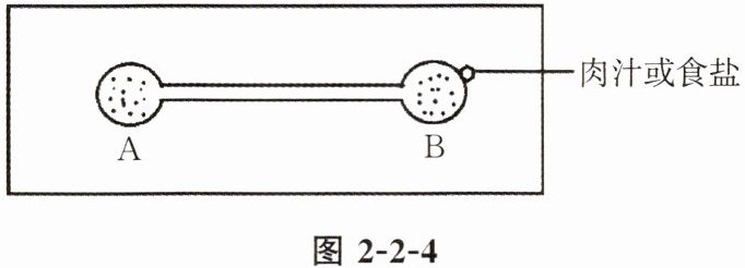 5. (科学探究)如图2-2-4所示,分别在载玻片的两端各滴一滴草履虫培养液,并使两滴培养液连通。在一片载玻片右侧培养液的边缘滴一滴肉汁,观察草履虫的移动方向。在另一片载玻片右侧培养液边缘放几小粒食盐,观察草履虫的移动方向。下列相关分析错误的是(