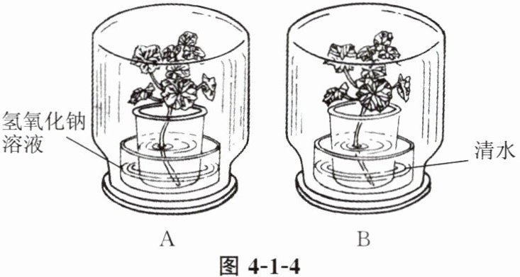 5. 图4-1-4是验证植物进行光合作用的条件的两套实验装置,A装置的水槽里放的是氢氧化钠溶液,B装置的水槽里放的是清水。把A、B两装置同时放在黑暗处24h,然后一起移到阳光下。据此回答下列问题。