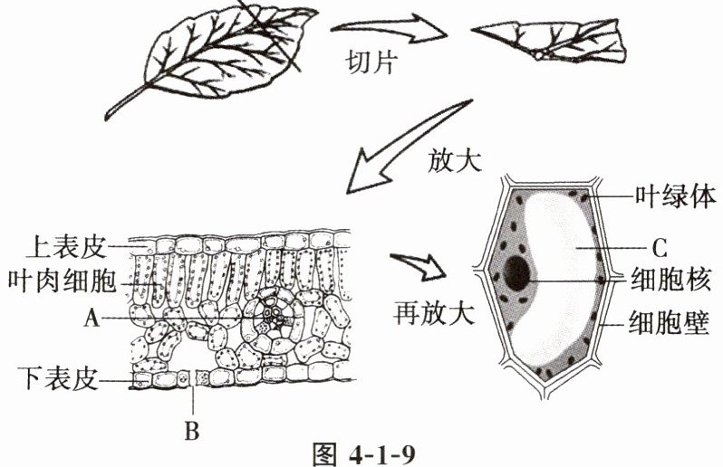 8. 图4-1-9表示将叶制成切片,并在显微镜下观察叶结构的情况,据图回答问题。