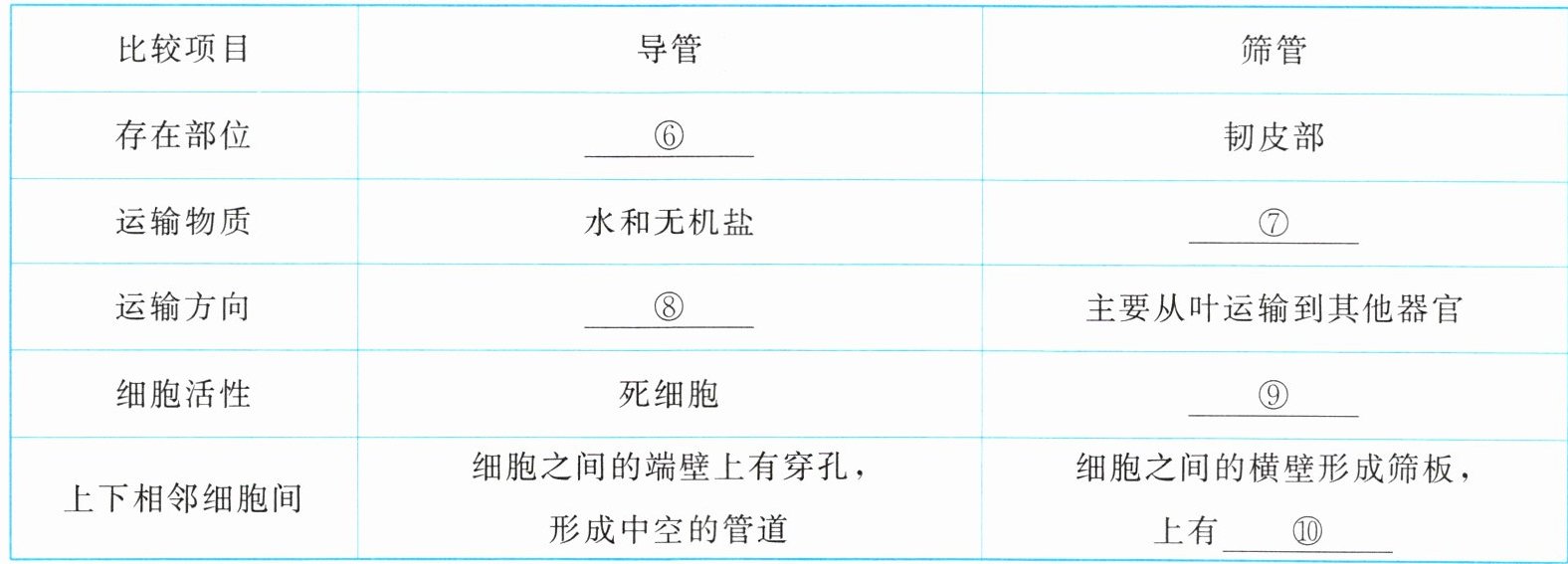 提示:①木质部 ②导管 ③导管 ④韧皮部 ⑤根尖和茎尖 ⑥木质部 ⑦有机物 ⑧自下而上 ⑨活细胞 ⑩筛孔