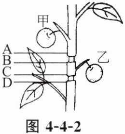 5. 图4-4-2是一棵果树上的枝条,甲、乙果实都没有成熟,在长有乙果实部位的上下各环割一圈,只伤及树皮。据图回答下列问题。