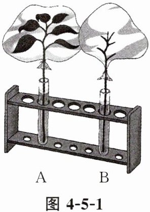 5. 从同一株植物上剪下两个大体相同的枝条。一个枝条上剪除全部叶,另一个枝条上保留部分叶,分别插入两支试管中(试管内有等量的水,水面上各滴有少量的植物油)。然后,用透明的塑料袋分别套在两个枝条上,袋口扎紧(如图4-5-1)。将此装置放在有阳光、温暖的地方数小时。据此回答下列问题。