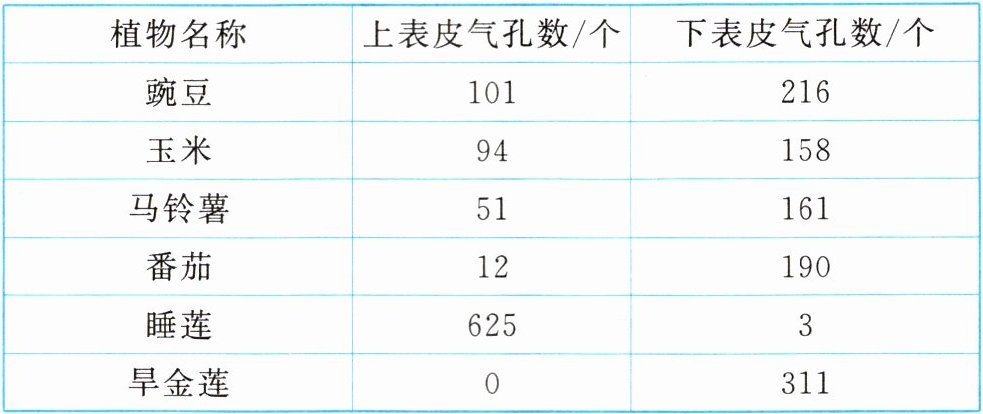 6. 下表是一些常见植物的叶的上、下表皮中的气孔数,请分析数据并回答下列问题。