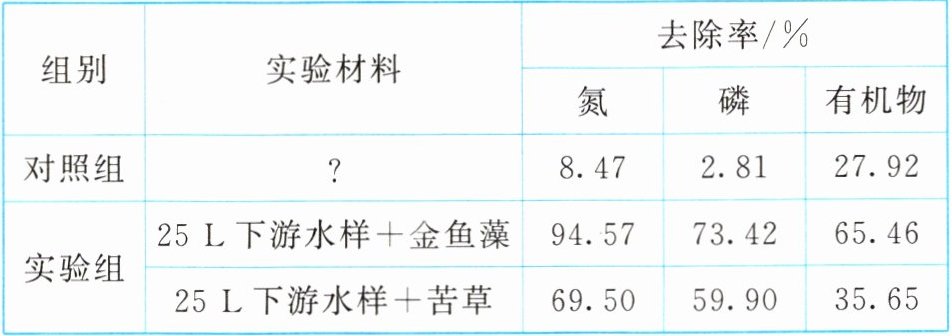 (1)实验一:探究沉水植物对水体中氮、磷及有机物的去除率。实验处理及实验结果如下表。