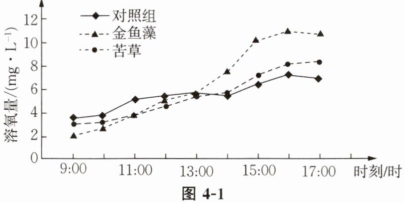 (2)实验二:探究沉水植物对水体溶氧量的影响。科研人员于某日9:00~17:00监测以上对照组和实验组的溶氧量变化,结果如图4-1所示。
