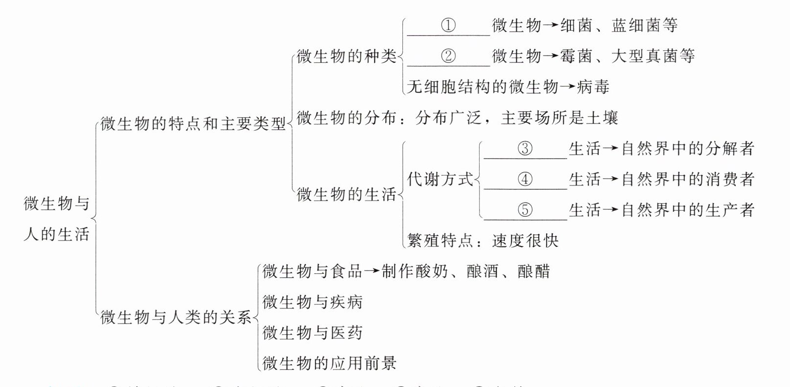 提示:①单细胞 ②多细胞 ③腐生 ④寄生 ⑤自养
