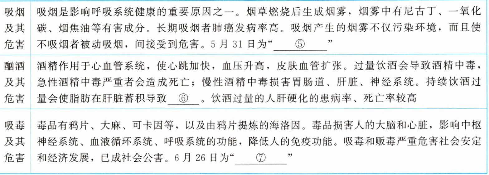 ①社会适应 ②道德修养 ③生活有规律 ④合理用药 ⑤世界无烟日 ⑥脂肪肝 ⑦国际禁毒日 ⑧明确诊断 ⑨科学 ⑩合理 ⑪医嘱 ⑫抗生素 ⑬良好的居室 ⑭良好的水