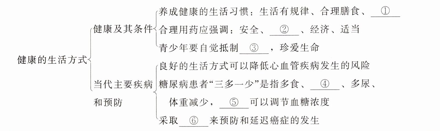 提示:①合理用药及拒绝吸烟、酗酒、吸毒等 ②有效 ③毒品 ④多饮 ⑤胰岛素 ⑥健康的生活方式