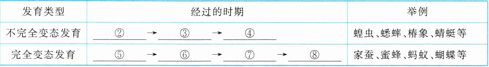 1. 变态 2. ②受精卵 ③若虫 ④成虫 ⑤受精卵 ⑥幼虫 ⑦蛹 ⑧成虫 3. 蜕皮