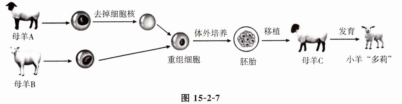 2. 图15-2-7为小羊“多莉”的诞生过程,小羊“多莉”长得既不像C羊也不像A羊,而与B羊十分相像,这说明细胞中控制着生物发育和遗传的结构是(
