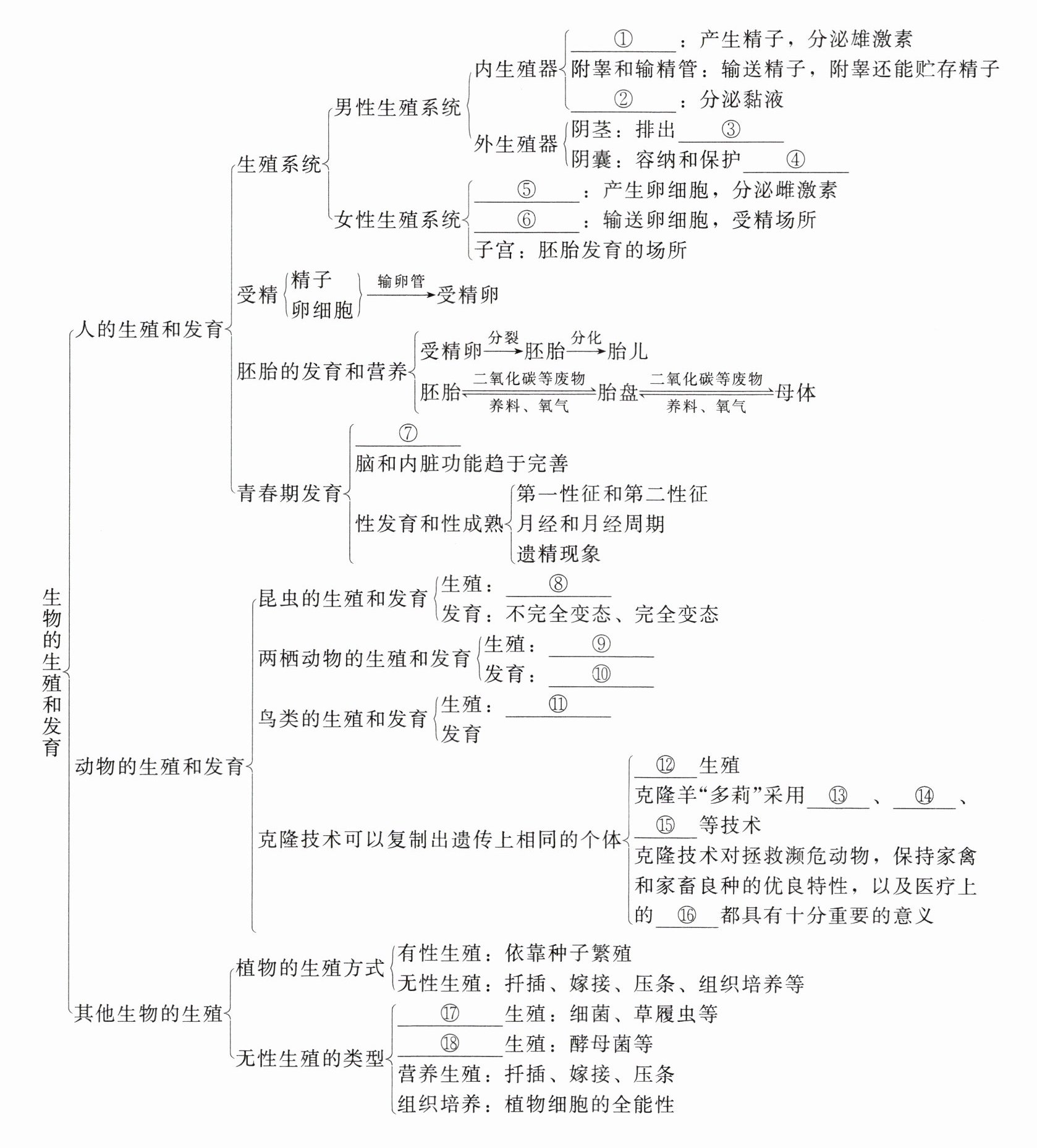 提示:①睾丸 ②精囊腺和前列腺 ③精液和尿液 ④睾丸及附睾 ⑤卵巢 ⑥输卵管 ⑦身高和体重突增 ⑧体内受精、卵生 ⑨体外受精、卵生 ⑩变态发育 ⑪体内受精、卵生 ⑫无性 ⑬细胞融合 ⑭细胞培养 ⑮胚胎移植 ⑯器官移植 ⑰分裂 ⑱出芽