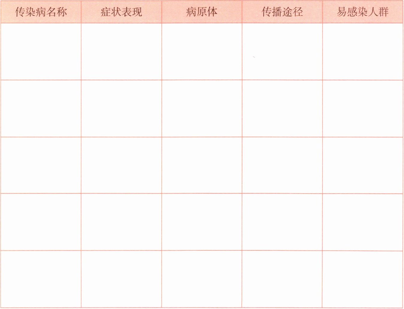 |传染病名称|症状表现|病原体|传播途径|易感染人群|