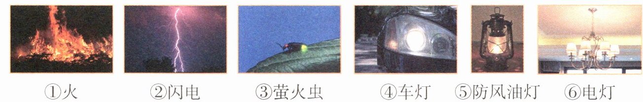 ①火 ②闪电 ③萤火虫 ④车灯 ⑤防风油灯 ⑥电灯