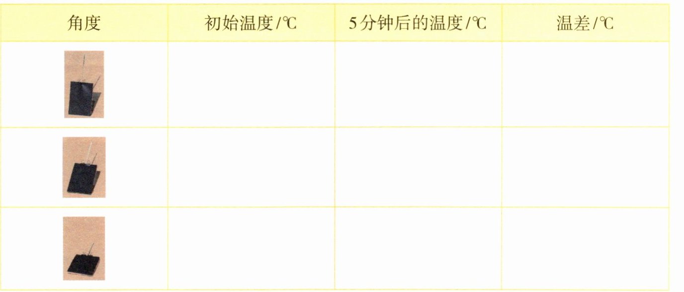 2. 将倾斜角度不同的黑色纸袋同时放在阳光下,记录温度计的读数。
