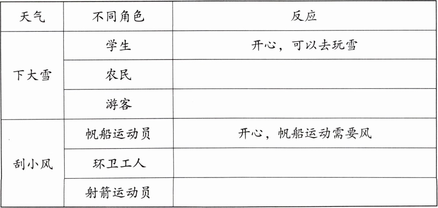 (二)面对同样的天气,不同角色的人分别会有什么反应呢?请你在表格中填一填。