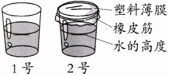 如下图,向两个大小相同的杯子里加入等量的水。其中一个杯子用塑料薄膜盖好,另一个不盖。