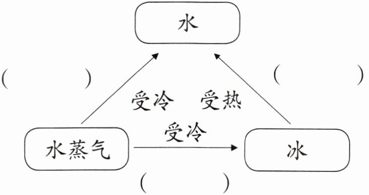 水、冰和水蒸气是水在自然界中的三种形态,在一定条件下,它们可以相互转化。请按要求用箭头将剩余的转化关系表示出来,并在( )内写上“受冷”或“受热”。