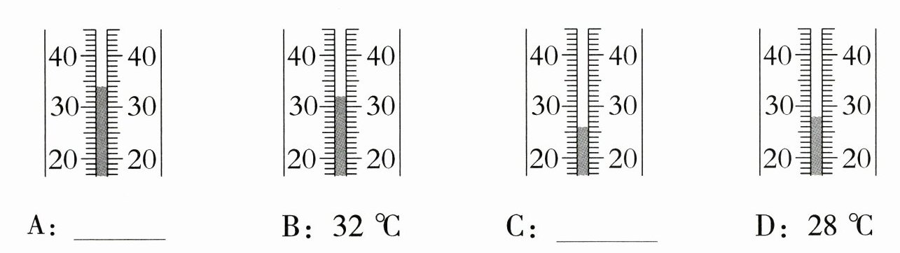 (1)小明在 9 月 12 日这天的 4 个不同时间点(6 时、10 时、14 时、18 时)记录的气温如下图所示,由于匆忙,有几个没有及时读数,并且顺序有误,你能帮帮他吗?请在横线处写出 A、C 气温计上的示数。