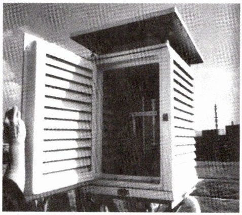 百叶箱(如右图)是用来放置气温计和湿度仪的木箱,是气象站和观测场最醒目的标志之一。百叶箱的四壁由两层薄的木板条组成,外层百叶条向内倾斜,内层百叶条向外倾斜,百叶条与水平方向的交角是45°。箱底由3块木板组成,每块宽110毫米,中间一块比边上两块稍高一些,箱盖有两层。整个百叶箱都是白色,为了避免太阳直射,放置时一般箱门朝北。