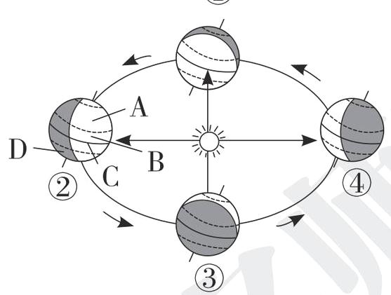 4. 当地球绕太阳转动到②处时,A 点处于____季,D 点处于____季。