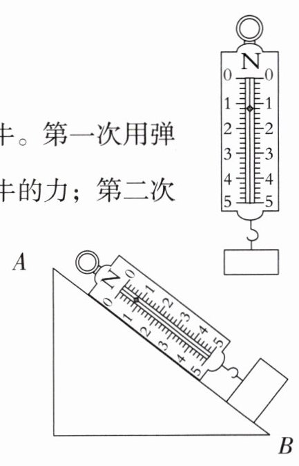 (1)如右图所示,使用的弹簧测力计的量程是______牛。第一次用弹簧测力计拉着物体直接提升到A处,需要______牛的力;第二次用弹簧测力计将物体从B处沿斜面拉到A处,需要______牛的力。两次相比,用力比较小的是第______次,这说明______。