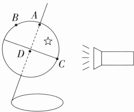 (4)地球模型上的 A、B、C、D 4 个点中,现在正处于正午 12 点的是____点,即将进入黎明的是____点,在地球自转的过程中会出现极昼现象的是____点。