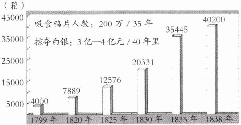 (1)仔细观察材料一中的示意图,英国每年输入中国的鸦片呈现出怎样的趋势?依据图中信息及所学知识分析鸦片输入给中国带来的危害。