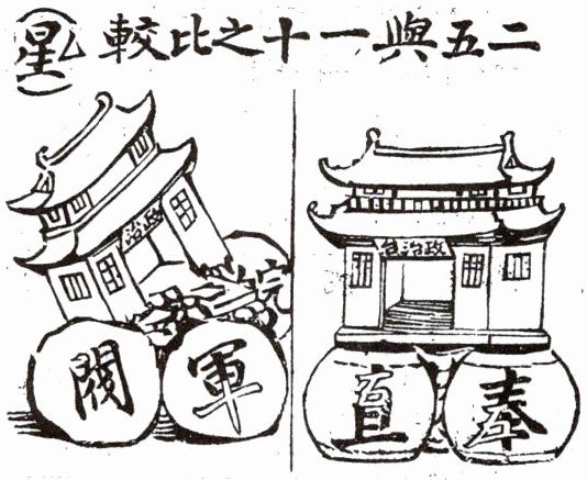 (图中是一幅漫画,标题为“二五与一十之比较”,画面中有两座建筑,左边建筑下有“军阀”字样,右边建筑下有“直系奉”字样)