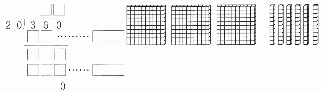 1. 360本书平均分给20个班级,每班能分到多少本书?结合分书的过程,说一说每一步算式的意思。(一个方块代表一本书)