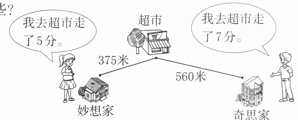 3. 小明以40米/分的速度从家出发,步行上学,5分后,他想起作业还未完成,于是加快速度,以50米/分的速度赶去学校,又走了7分到达学校。小明家到学校多少米?