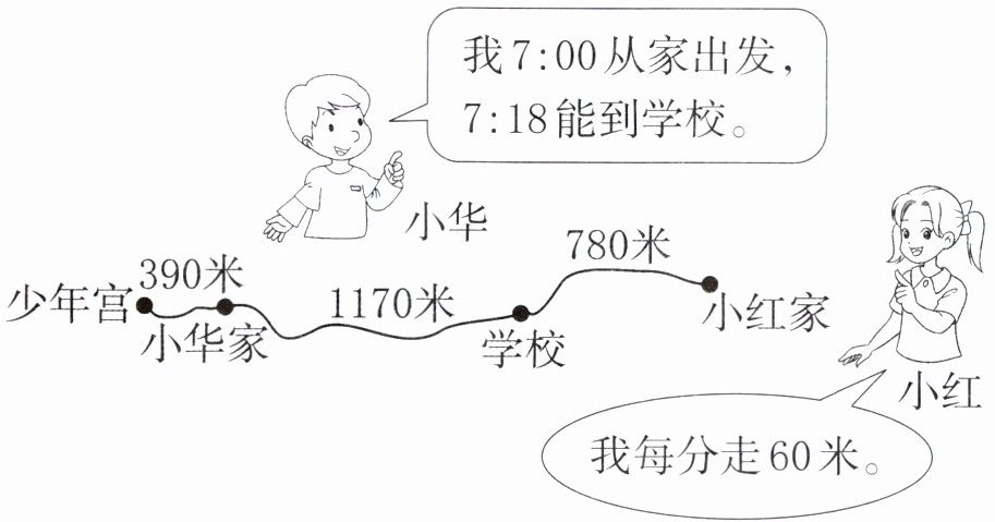 3. 小华平均每分走多少米?照这样的速度,他从学校到小红家需要多少时间?